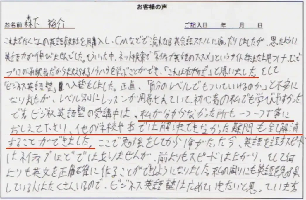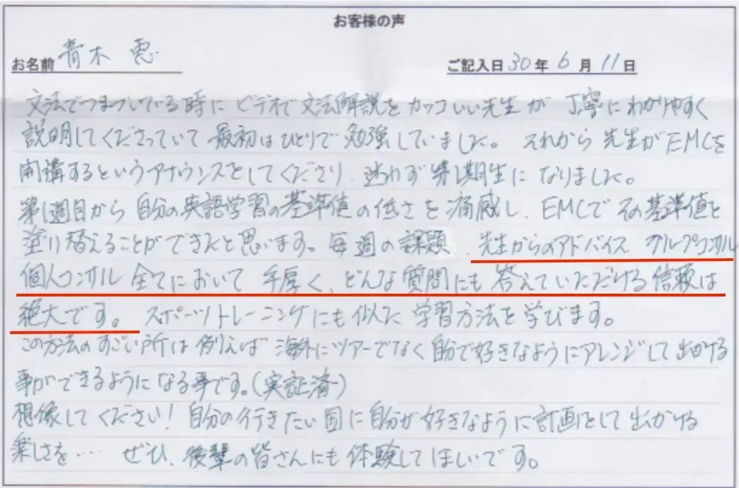 「あっ、これなら安心して、英語学習を続けられる。この英語塾のことをもっと早く知っておけば良かったなぁ・・。」と感じました。