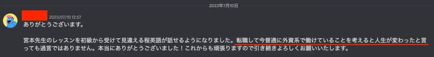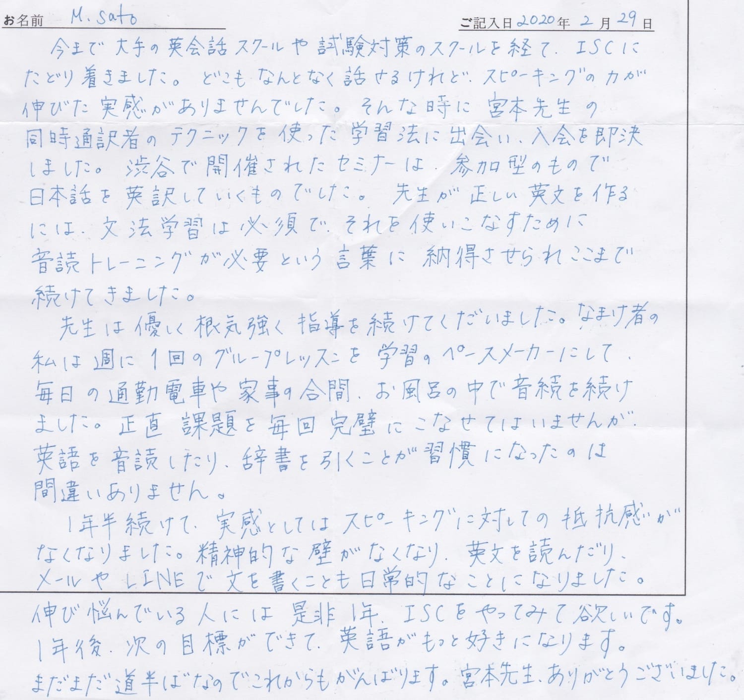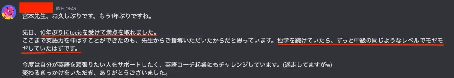 「入るか入らないか検討する時間が無駄なくらい、英語を習得したい人は本当にお勧めです!宮本先生が実際に費やしてきた学習全てを全て教えてもらえるので、金額も安いと思えるくらい価値のあるコースでした」