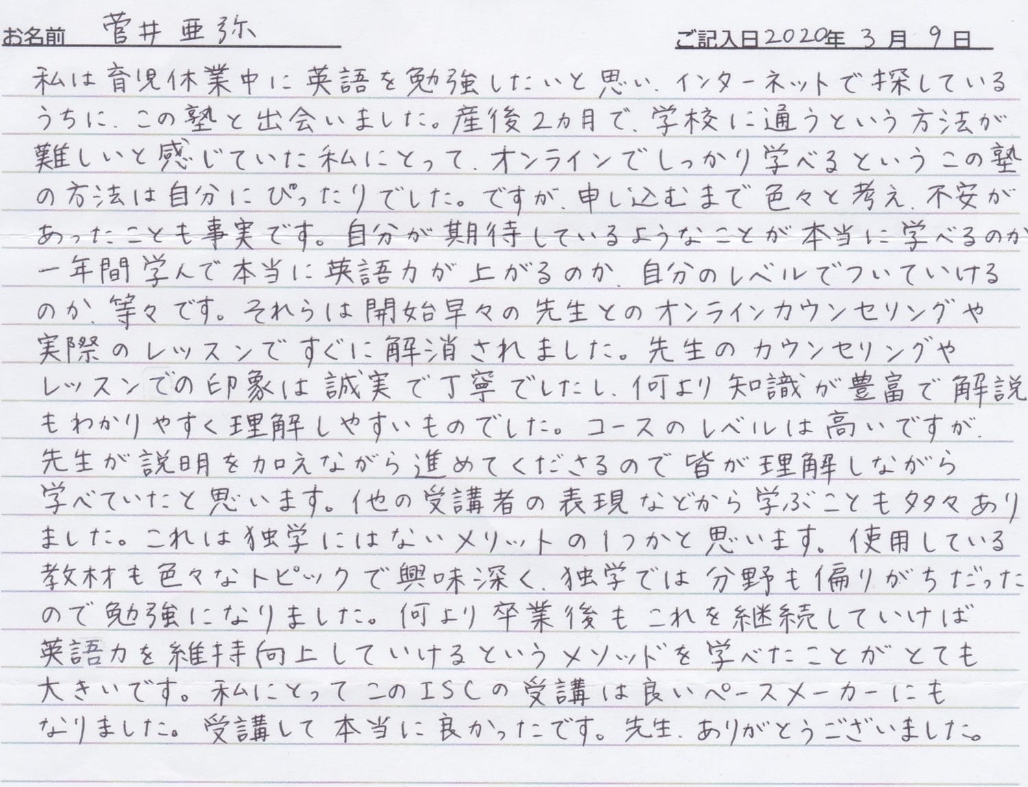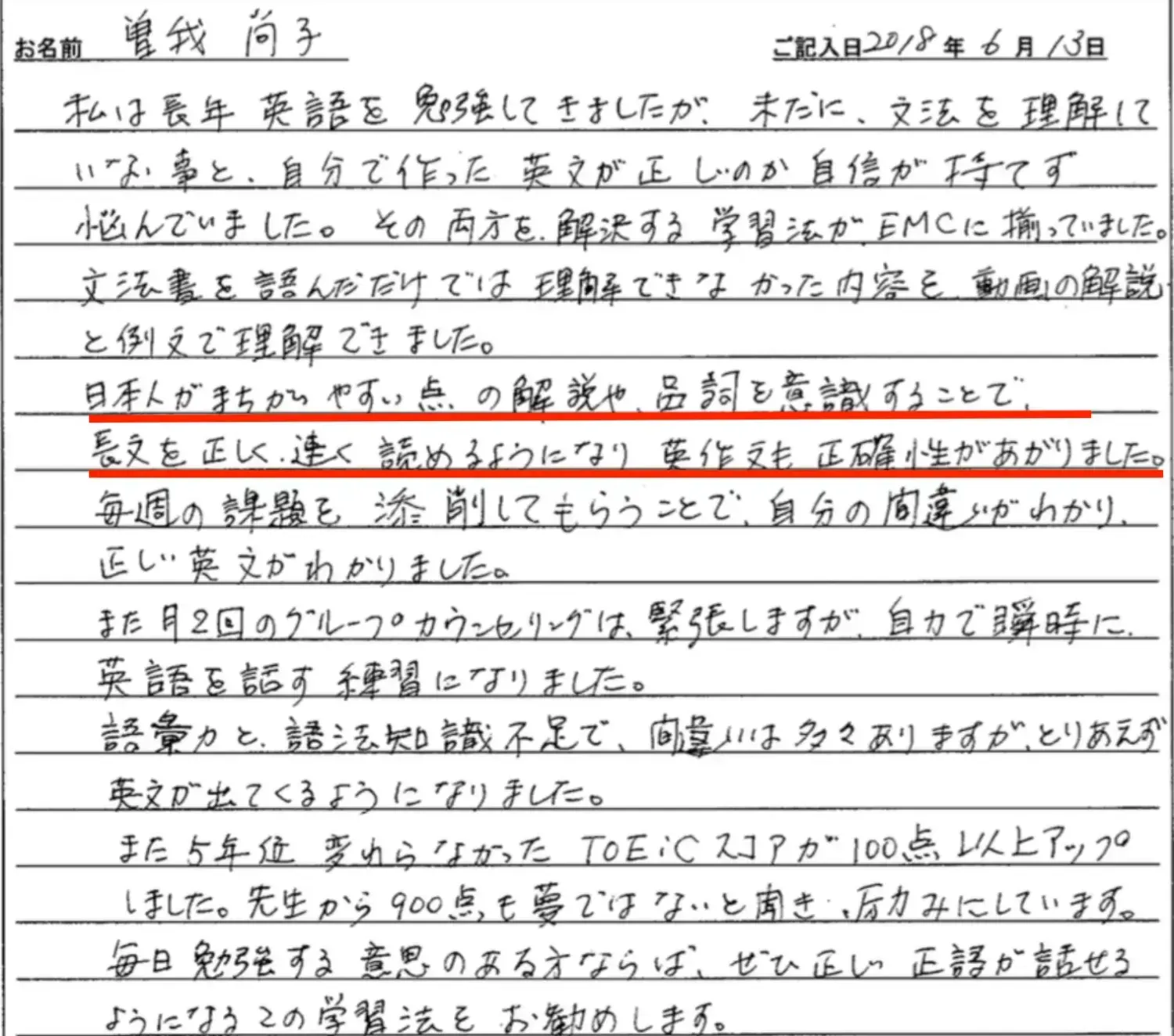 一番実感できたことは、今まで一度も長い英文を書いたことがなかった私がだいぶ正確に(長い英文を)書けるようになりました。